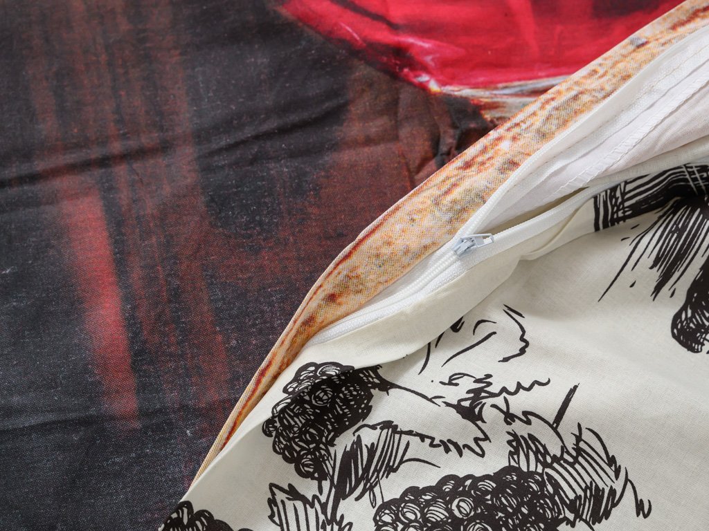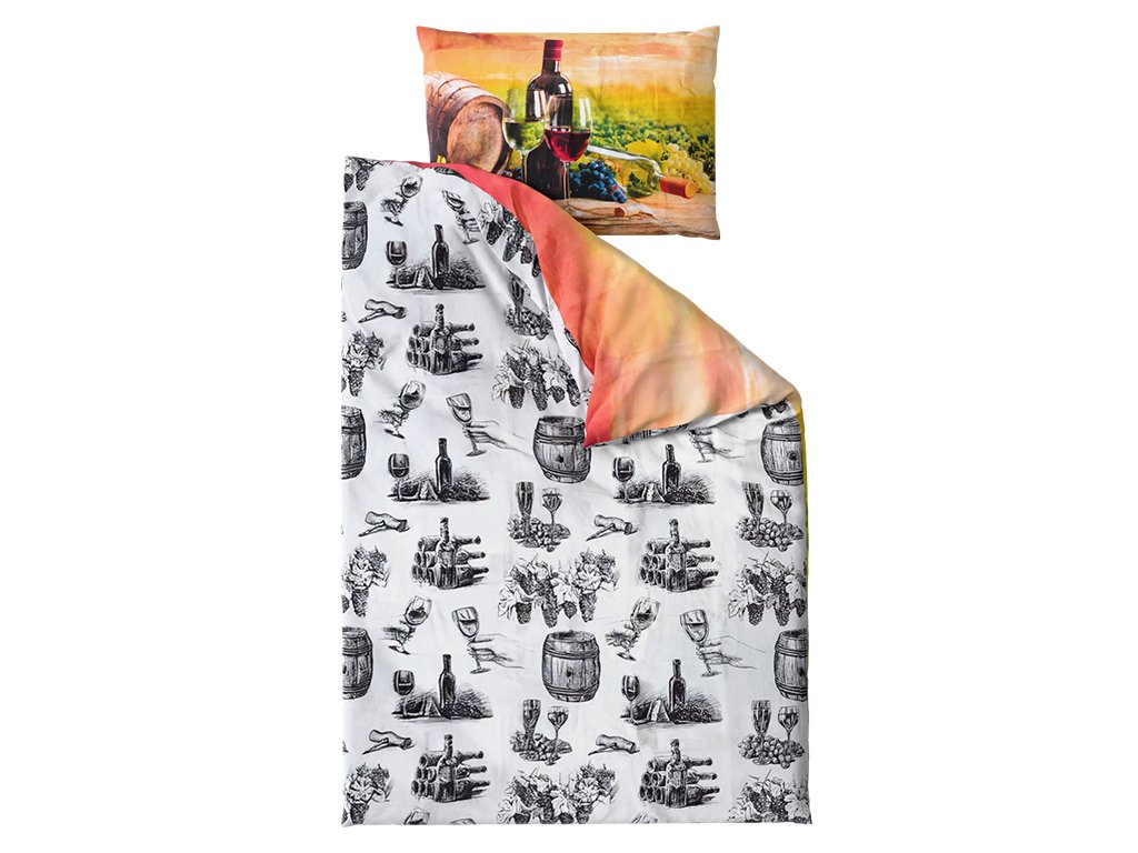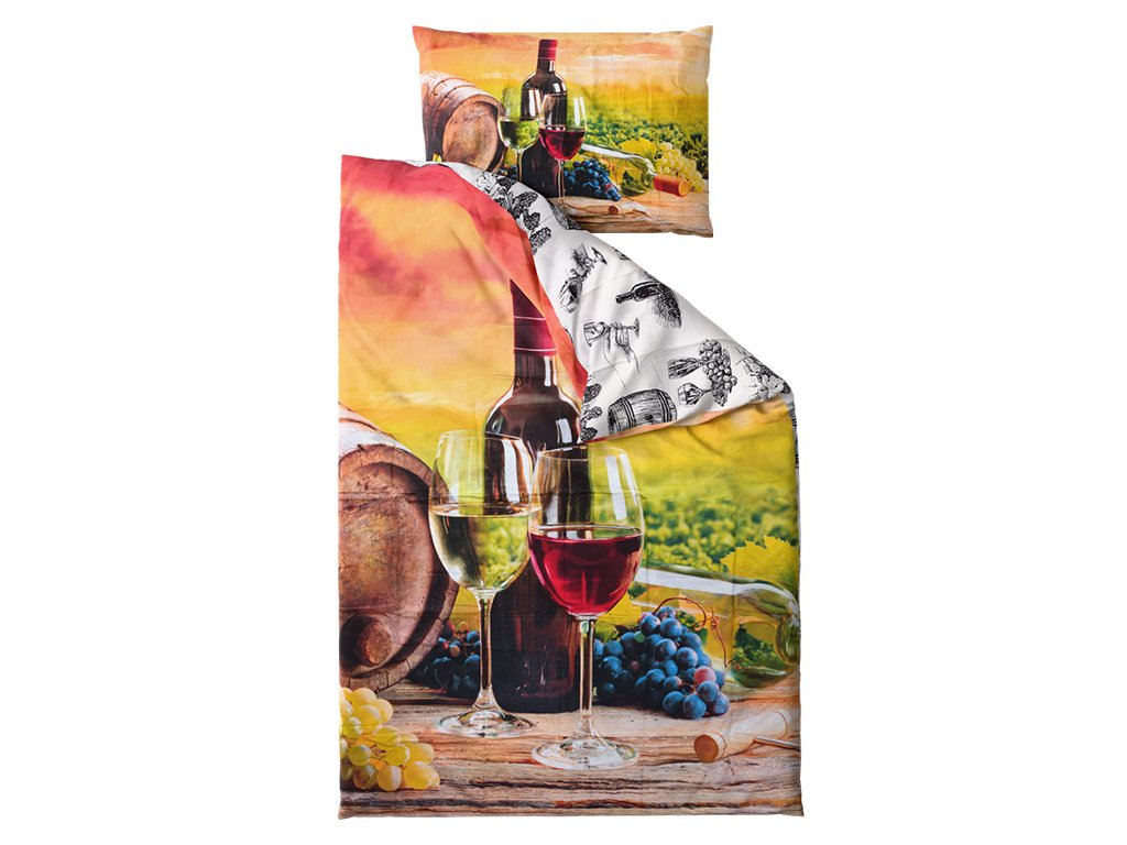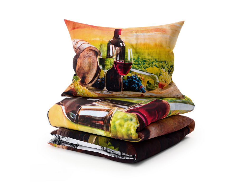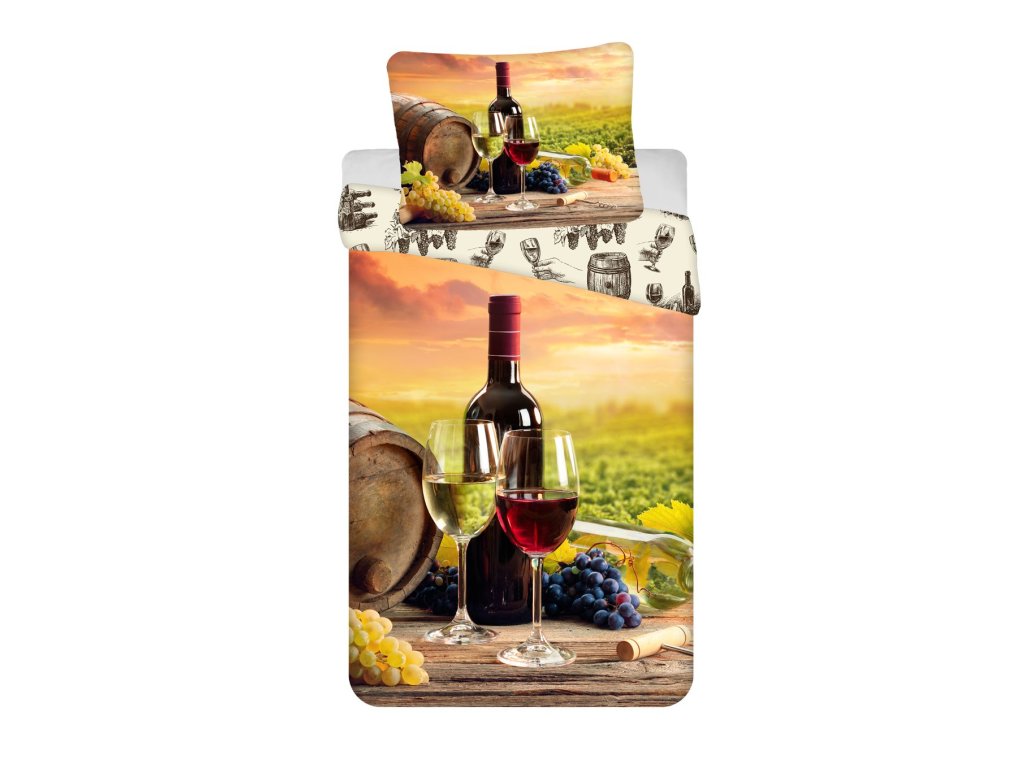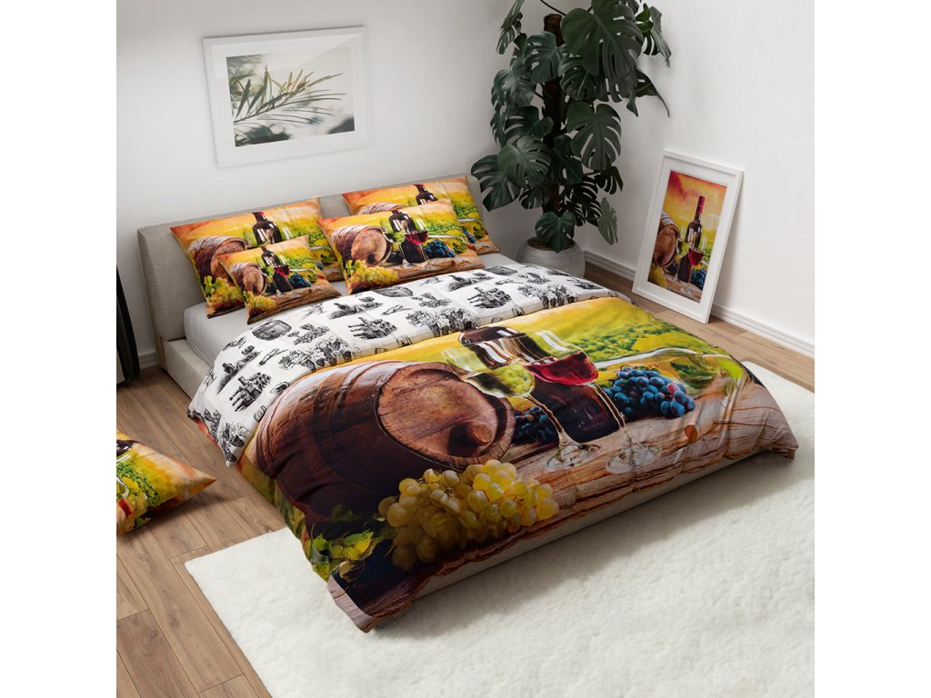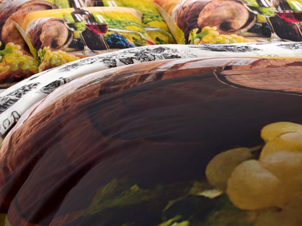 Priuštite si osjećaj smirenosti i romantike s posteljinom VINE, koja vas prenosi u srce vinograda. Realističan 3D otisak s motivom vina, čaša i bureta na pozadini zalazećeg sunca stvara jedinstvenu atmosferu. Posteljina je izrađena od 100% pamuka, što jamči mekoću, prozračnost i dugotrajnost.