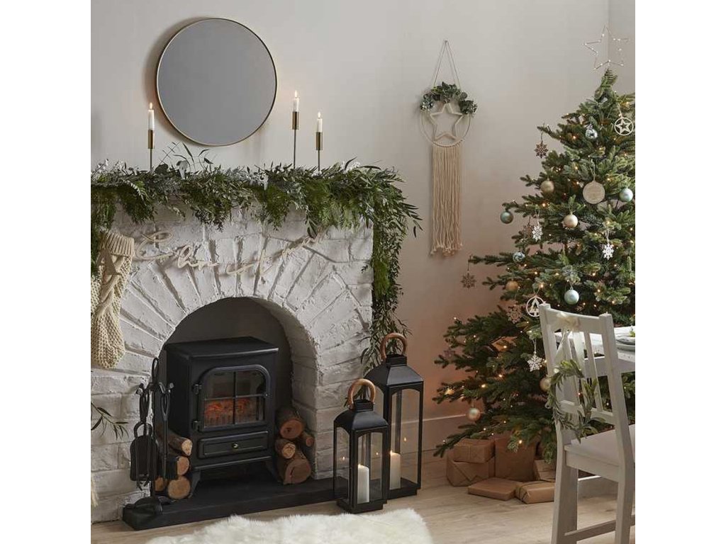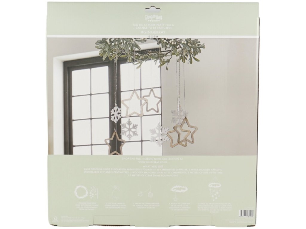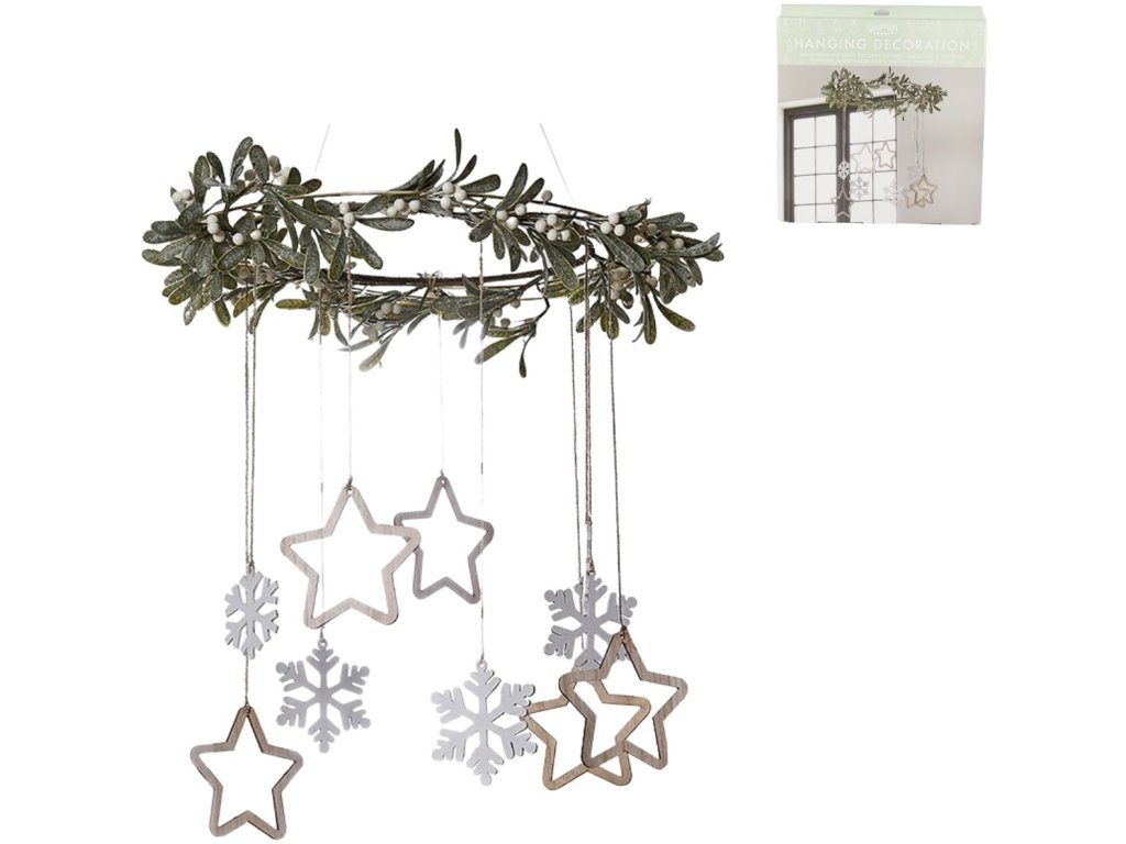- Set sadrži: 1 vijenac s umjetnim imelinom, 5 bijelih drvenih pahulja i 5 drvenih zvijezda