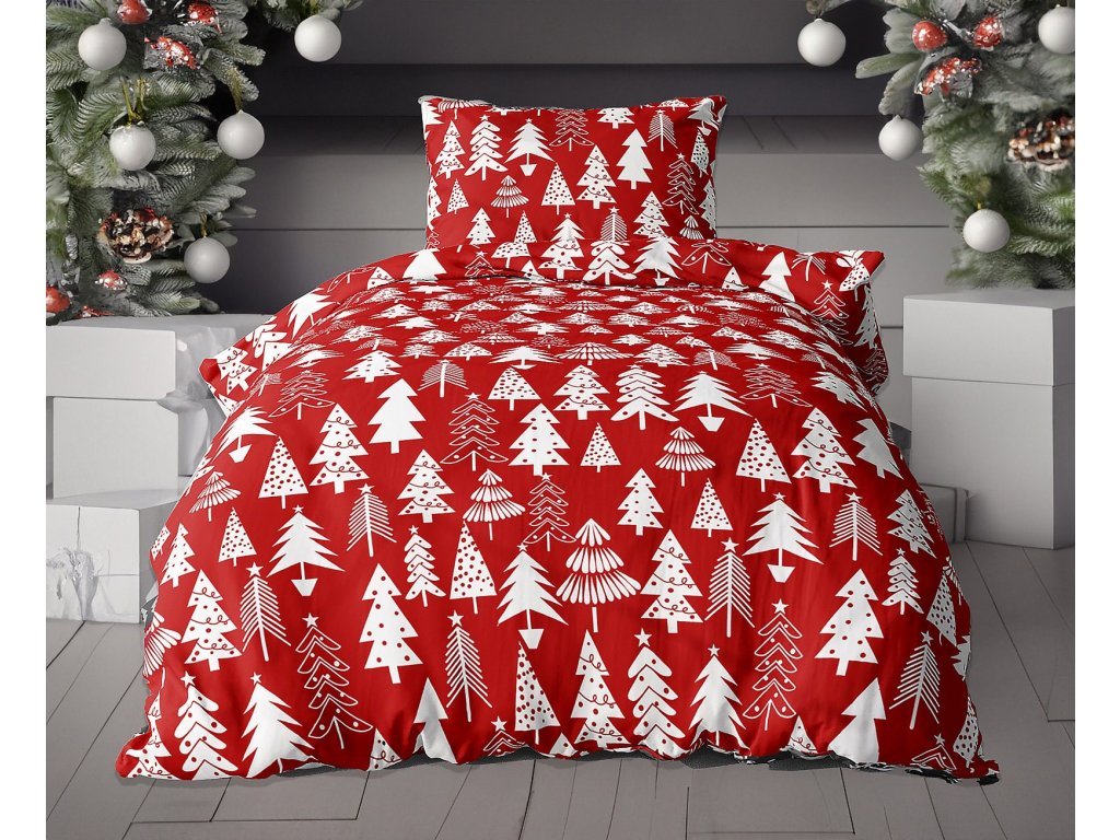 2x posteljina od flanela CHRISTMAS TREES crvena + plahta od mikropliša SOFT 180x200 cm bijela