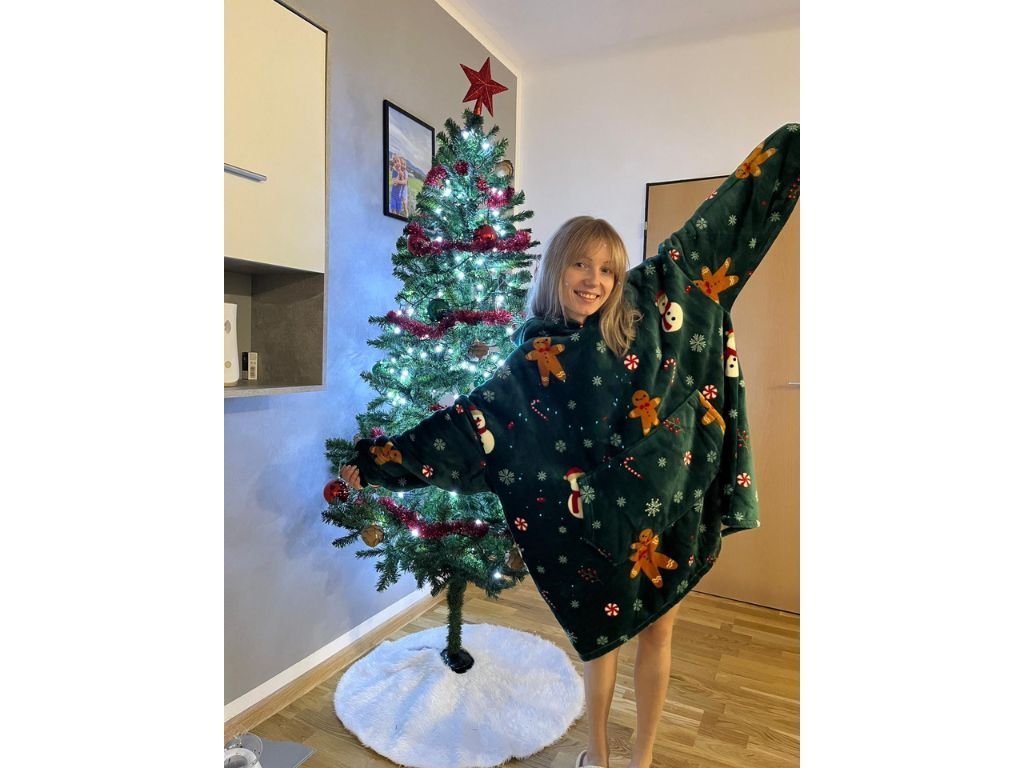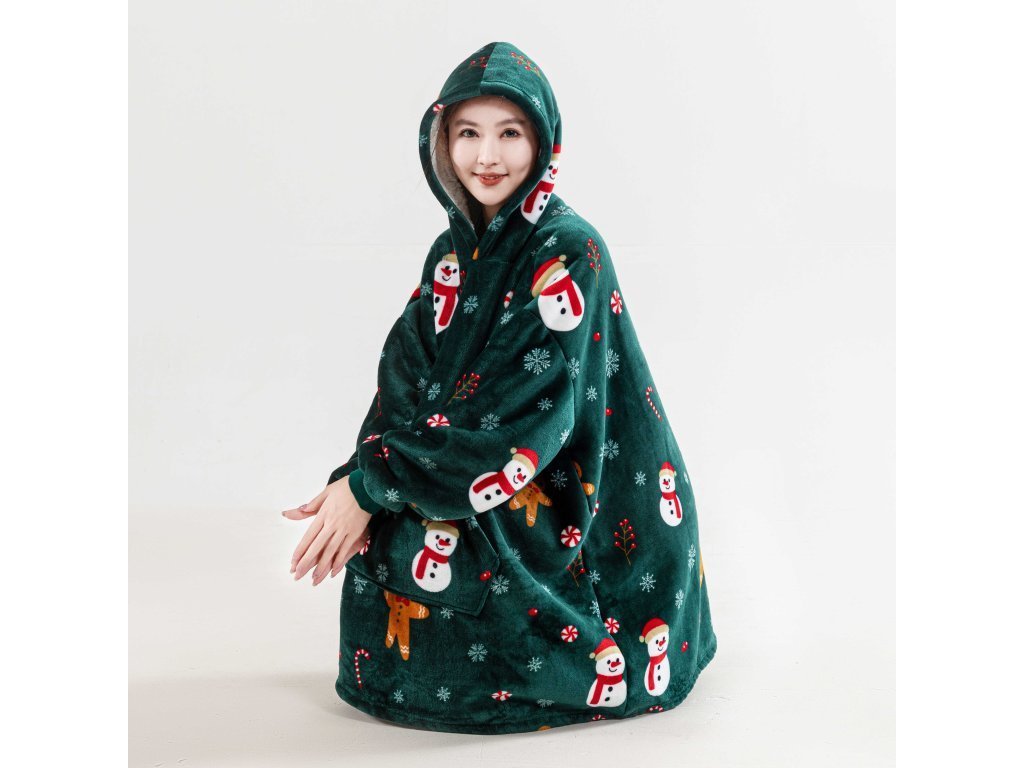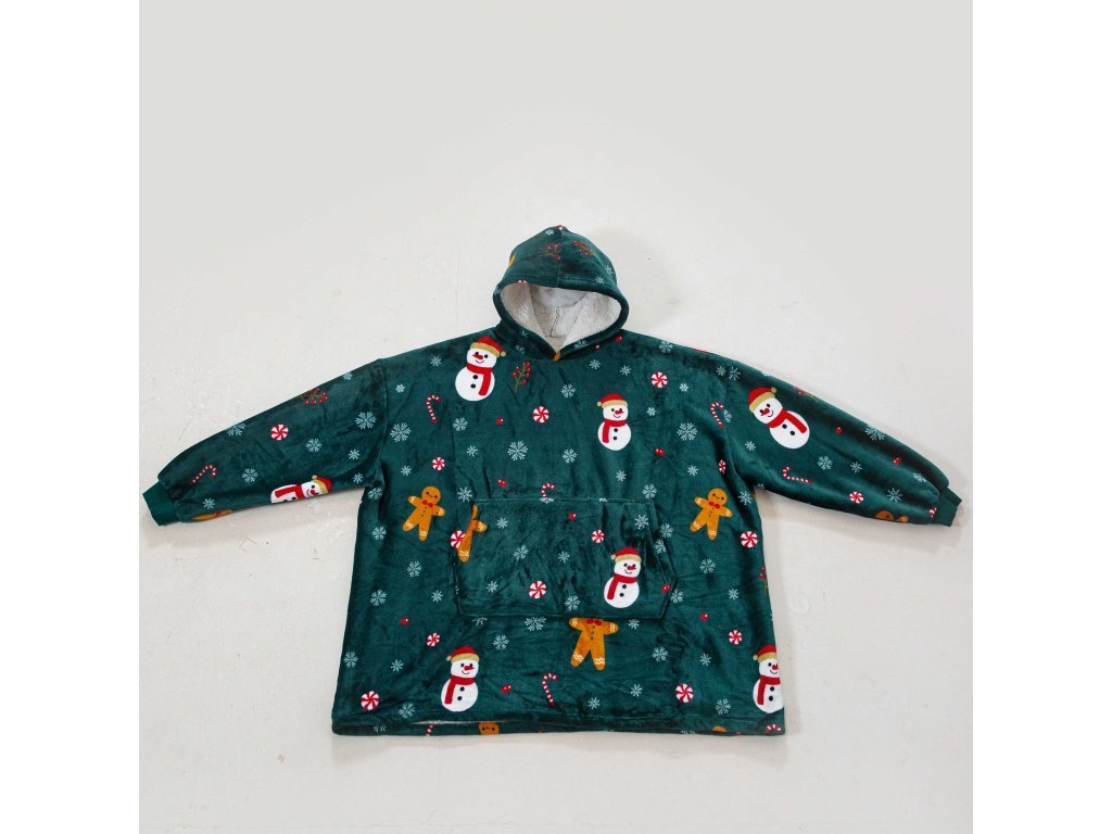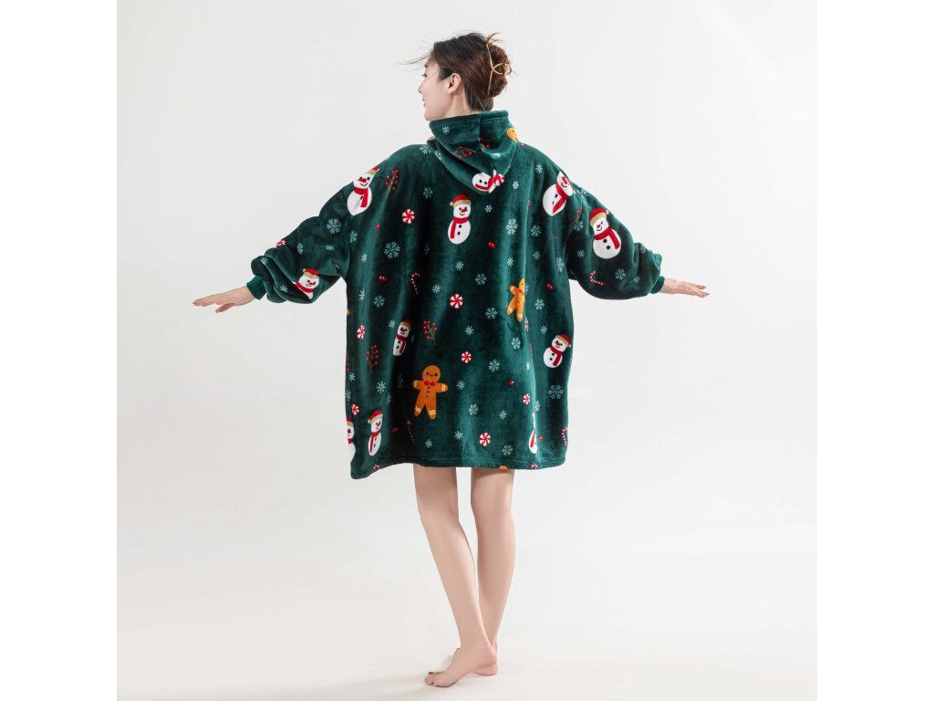 Topla deka s imitacijom ovčjeg krzna, s rukavima i kapuljačom SNOWMAN AND GINGERBREAD zelena