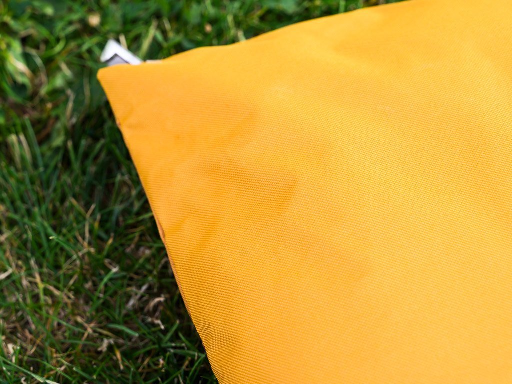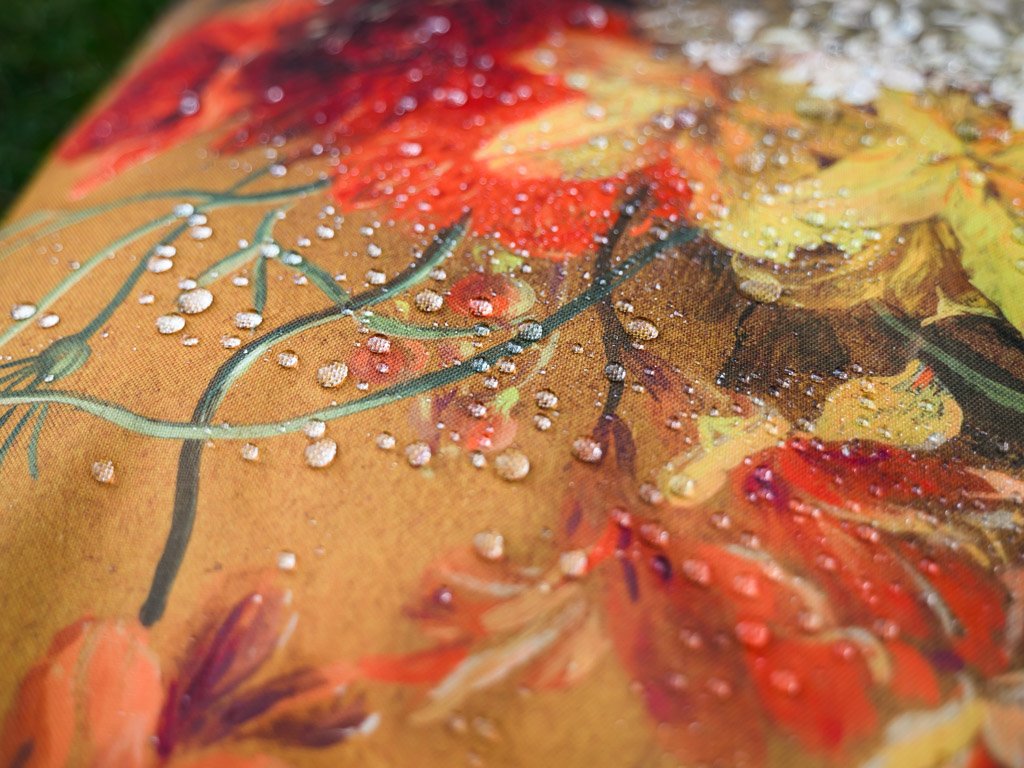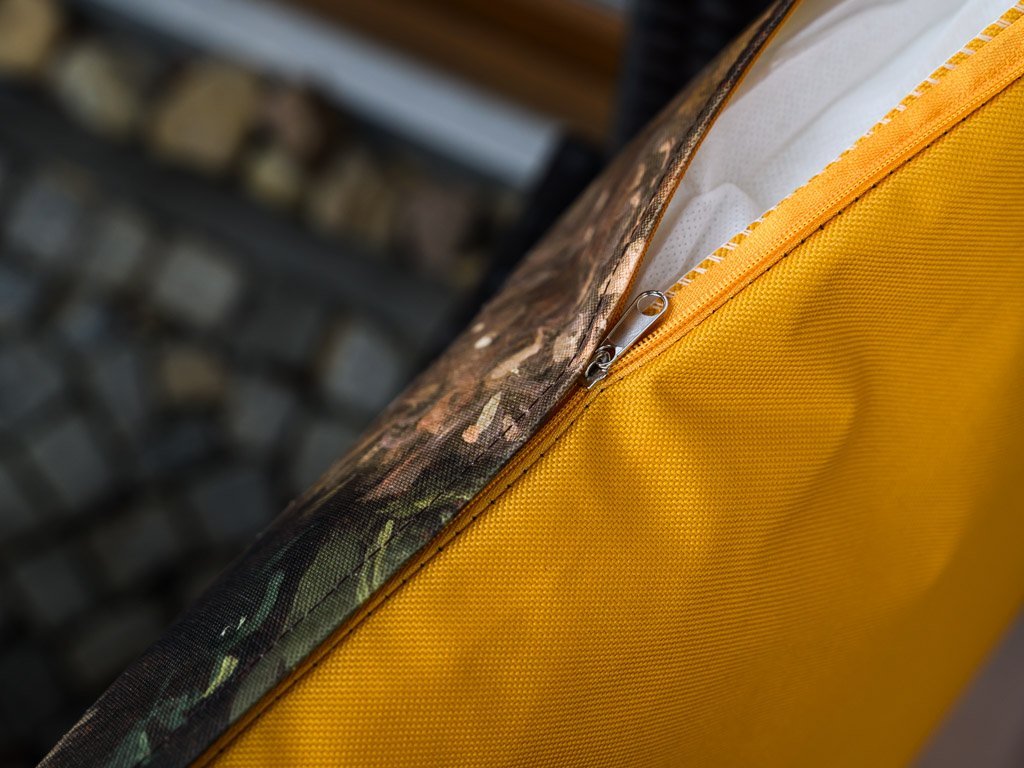 Jastuk ima na prednjoj strani šareni tisak a na stražnjoj strani jednobojnu oker žutu. Otporan je na vodu i UV zračenje, što osigurava dugi životni vijek i postojanost boja. Izrađen je od 100% poliestera, nudi udobnost i jednostavno održavanje.