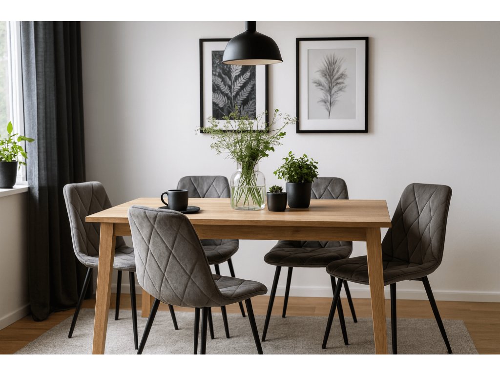 Neutralne boje su odlična osnova za svaki interijer. Miješanjem neutralnih tonova s jednom izraženom bojom nastaje savršeno lagan prostor. Inspirirajte se skandinavskim zemljama, koje kombiniraju nježne boje s prirodnim materijalima. Skandinavske blagovaonice su pune svjetlosti, svježih začinskih biljaka, a uz to su i potpuno funkcionalne i praktične. Tamnosiva baršunasta blagovaonska stolica Libra postat će ukras vaše blagovaonice. Stolice nadopunite svijetlim stolom od drveta. U blagovaonici se pouzdajte u umjerene dodatke koji su korisni. Odaberite također viseće posude od lana, u koje ćete staviti zimzelene biljke ili začinsko bilje.