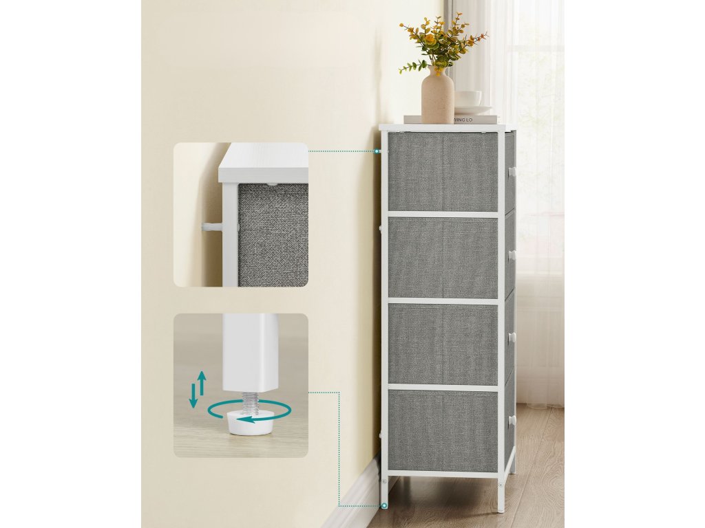 Ova stilizirana komoda u kombinaciji sive tkanine i bijele konstrukcije idealno je rješenje za svakodnevnu organizaciju. Bilo da je postavite u spavaću sobu za donje rublje, u predsoblje za dodatke ili u dječju sobu za igračke, uvijek će ponuditi dovoljno prostora zahvaljujući 4 prostrane ladice. Zahvaljujući laganoj konstrukciji lako se pomiče, ali ostaje stabilna zahvaljujući pojačanjima i mogućnosti pričvršćivanja na zid. Elegantni izgled i praktična uporaba čine je idealnim izborom za svaki dom.