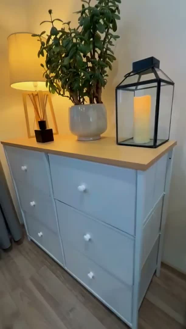 Ova stilska komoda u kombinaciji bijele tkanine i prirodnog dekor hrasta idealno je rješenje za svakodnevnu organizaciju. Bilo da je postavite u spavaću sobu za donje rublje, predvorje za dodatke ili dječju sobu za igračke, uvijek će ponuditi dovoljno prostora zahvaljujući 6 prostranim ladicama. Zbog lagane konstrukcije lako se premješta, a ipak ostaje stabilna zahvaljujući ojačanjima i mogućnosti pričvršćivanja za zid. Elegantni izgled i praktična uporaba čine je idealnim izborom za svaki dom.