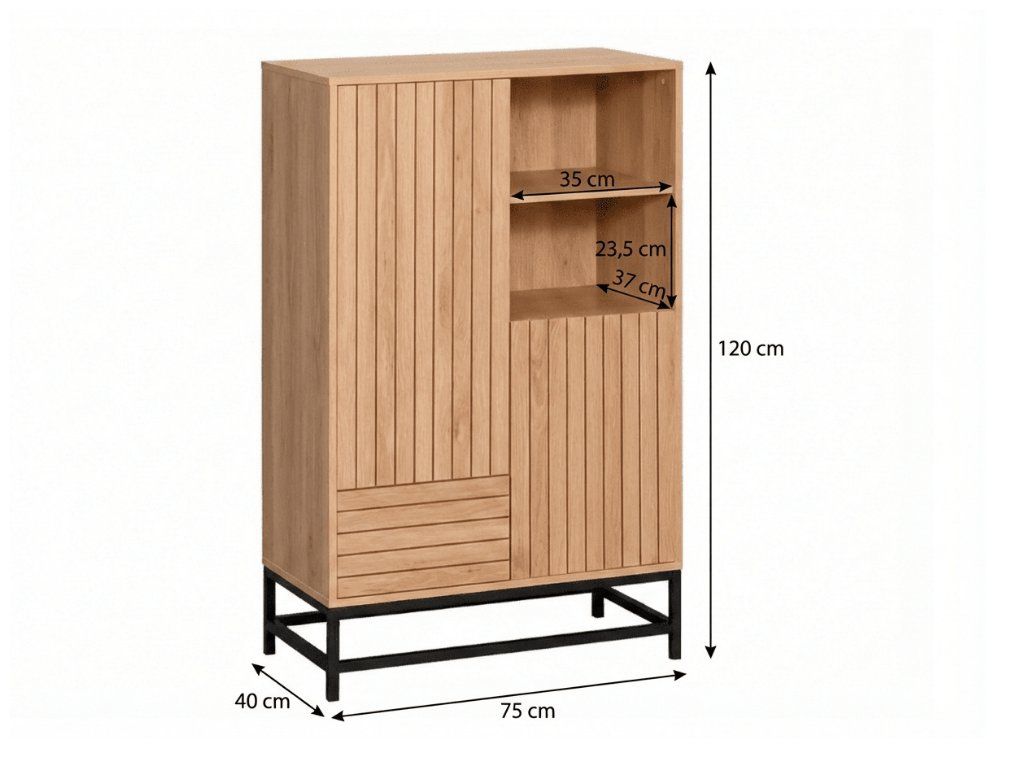 Ovaj ormar za pohranu idealan je izbor za svakodnevnu organizaciju domaćinstva. Zahvaljujući kombinaciji zatvorenih ormarića, ladice i otvorenog prostora, nudi praktično mjesto za pohranu svega što želite imati pri ruci, ali istovremeno uredno pohranjeno. Savršeno se uklapa u dnevnu sobu, predsoblje i radnu sobu, gdje pomaže zadržati preglednost i vizualni mir. Prirodni dekor hrasta u kombinaciji s metalnom konstrukcijom daje interijeru moderan i bezvremenski izgled koji se lako slaže s ostalim namještajem.