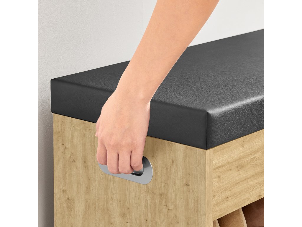 Ovaj ormarić za cipele s integriranom klupom predstavlja funkcionalno rješenje za svaki hodnik. Kombinira udobno sjedenje prilikom obuvanja s dovoljno prostora za pohranu cipela, dodataka ili sitnica koje želite imati uvijek pri ruci. Otvoreni pretinci i zatvoreni prostor omogućuju pregledno organiziranje obuće i pomažu održati red čak i u užurbanijem kućanstvu. Zahvaljujući kompaktnim dimenzijama, pogodan je i za manje hodnike gdje maksimalno iskorištava dostupan prostor. Tapecirano sjedalo osigurava udobnost i istodobno naglašava moderan izgled ormarića, koji se lako uklapa u različite stilove interijera.
