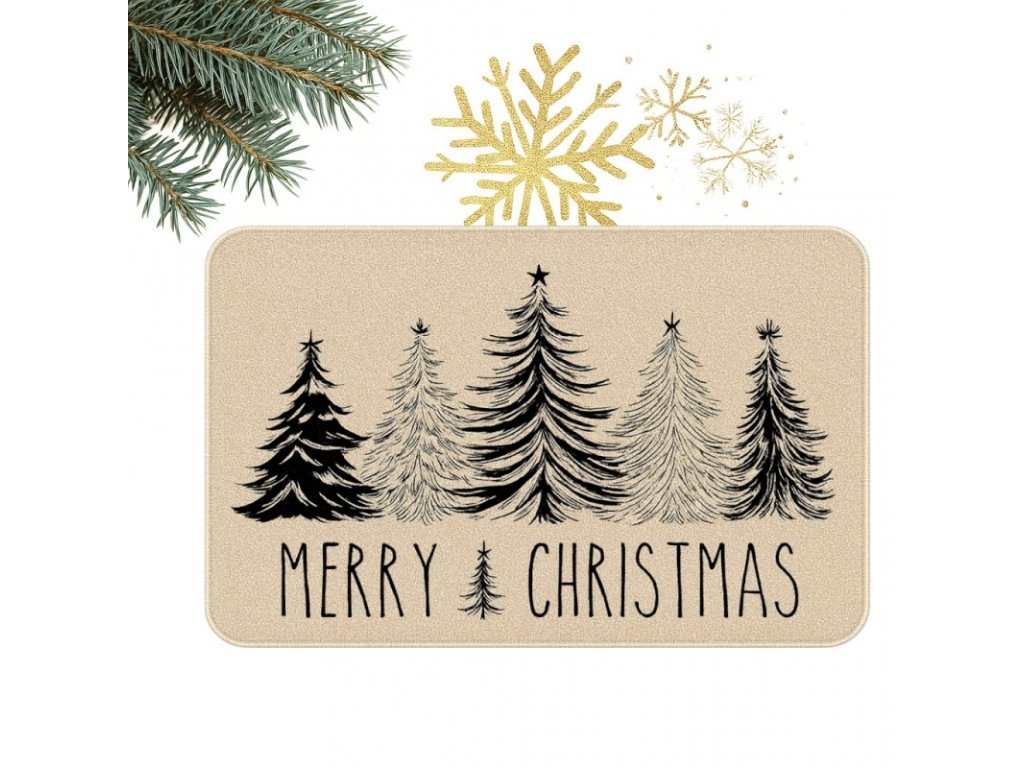 Božićna otirač BLACK FOREST vas dočekuje sa stilom odmah na ulazu. Otirač dimenzija 60 x 90 cm izrađen je od kvalitetnog poliestra, koji je izdržljiv i jednostavan za održavanje. Dizajn s crnim siluetama božićnih drvca i natpisom Merry Christmas na bež podlozi djeluje elegantno i razigrano. Protuklizna donja strana osigurava sigurno korištenje na različitim vrstama podova.