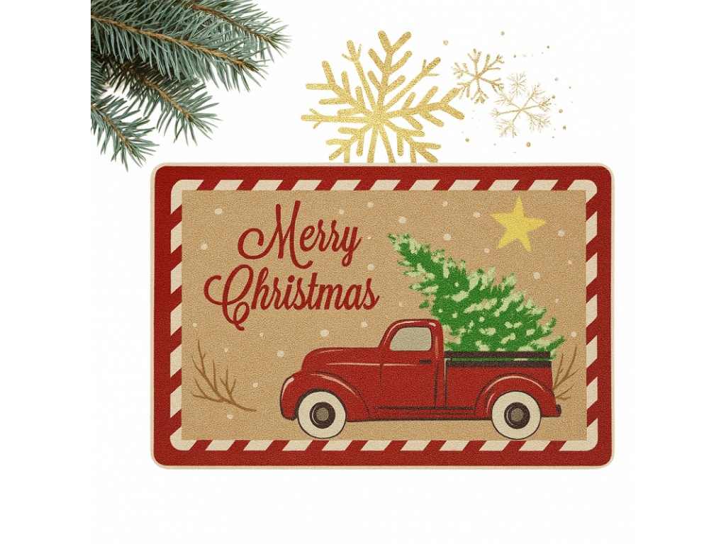 Božićni otirač HOLIDAY RIDE donosi veselu blagdansku atmosferu odmah s praga vašeg doma. Na otiraču dominira crveni retro kamion s bogato ukrašenim božićnim drvcem na teretnom prostoru i natpisom Merry Christmas, koji cijeloj sceni dodaje šarm. Izrađen je od kvalitetnog materijala s protukliznom donjom stranom, koja osigurava sigurnu upotrebu u interijeru i ispod natkrivenih ulaza. Dimenzije otirača su 60 x 90 cm.