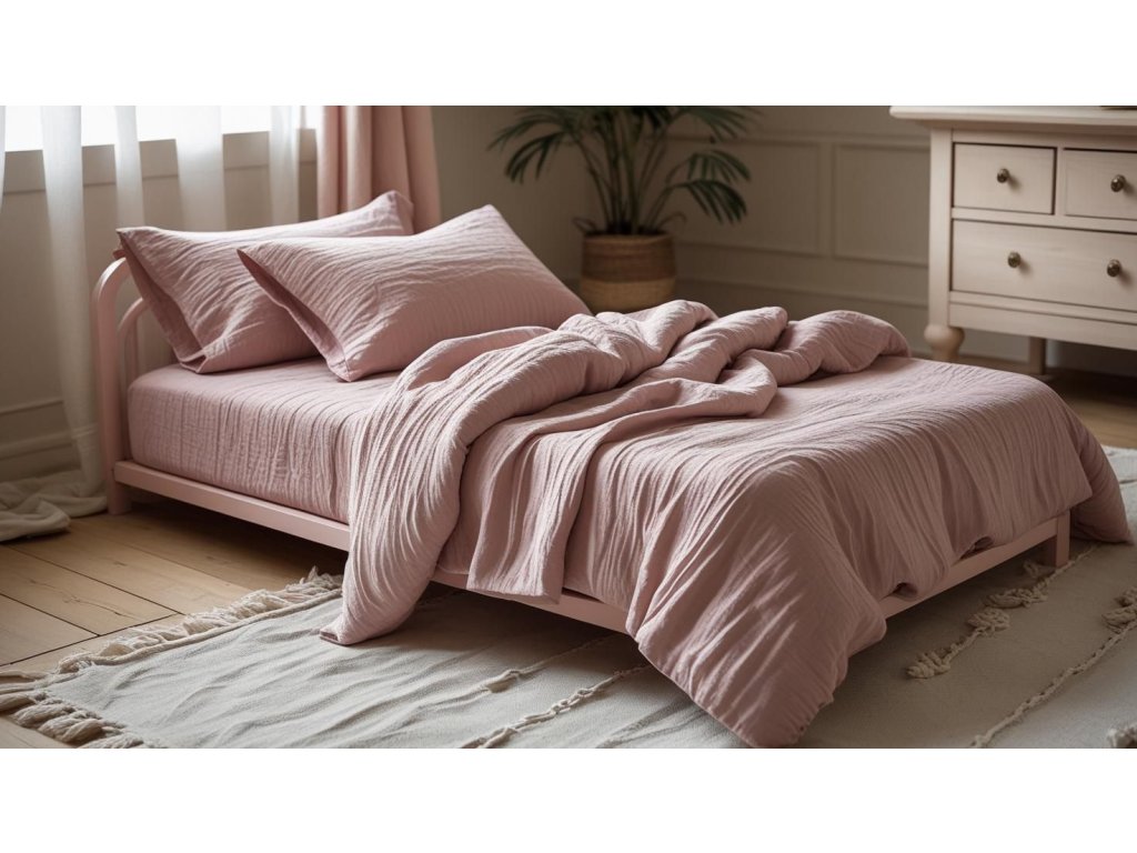 Mušelinsko posteljina od 100% pamuka je izuzetno lagana, prozračna i ugodna na dodir, idealna za ljetne mjesece i cjelogodišnju udobnost. Izrađena je od kvalitetne prirodne pređe u otvorenom pletivu vlakana, što osigurava visoku prozračnost i brzo sušenje. Zbog svoje nježnosti prikladna je i za osjetljivu kožu. Ne zahtijeva glačanje, a sa svakim pranjem postaje mekša, a prirodno naboran izgled lijepo se uklapa u skandinavski, boho i prirodni stil interijera.