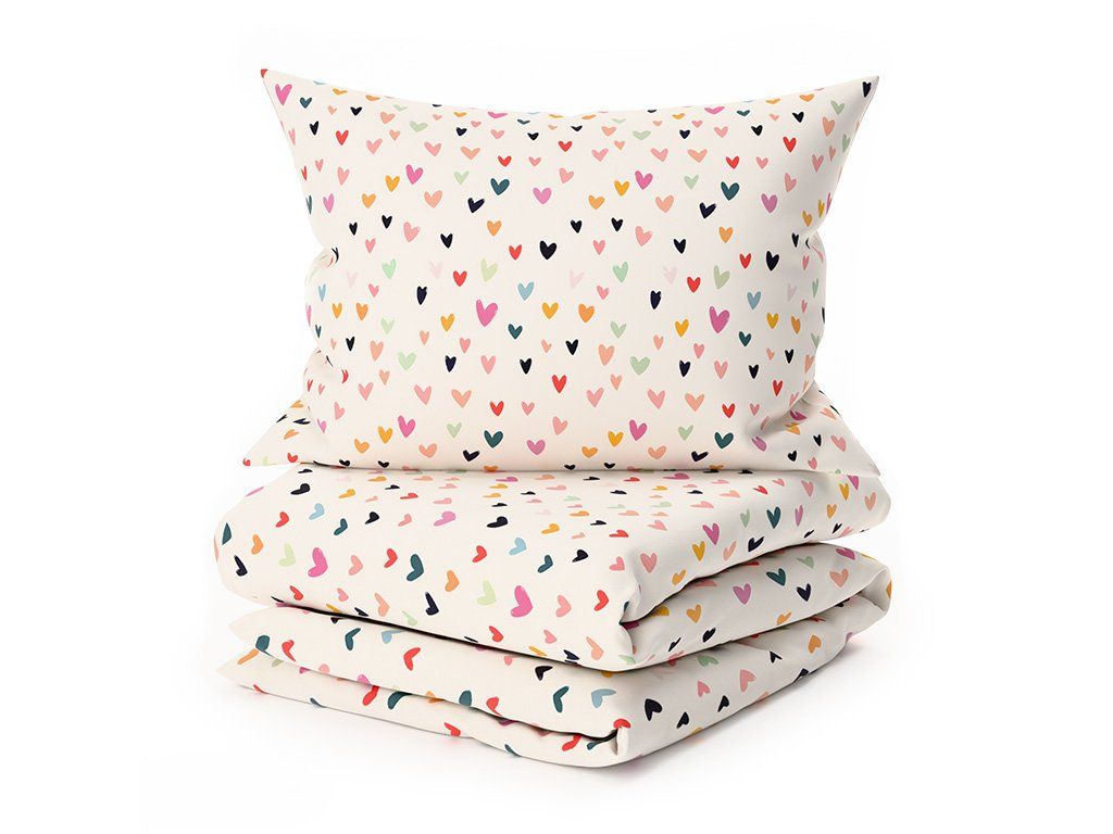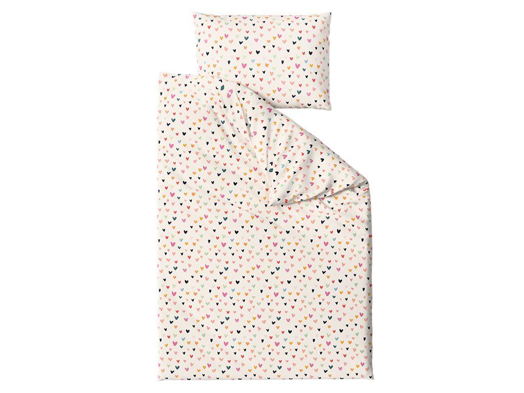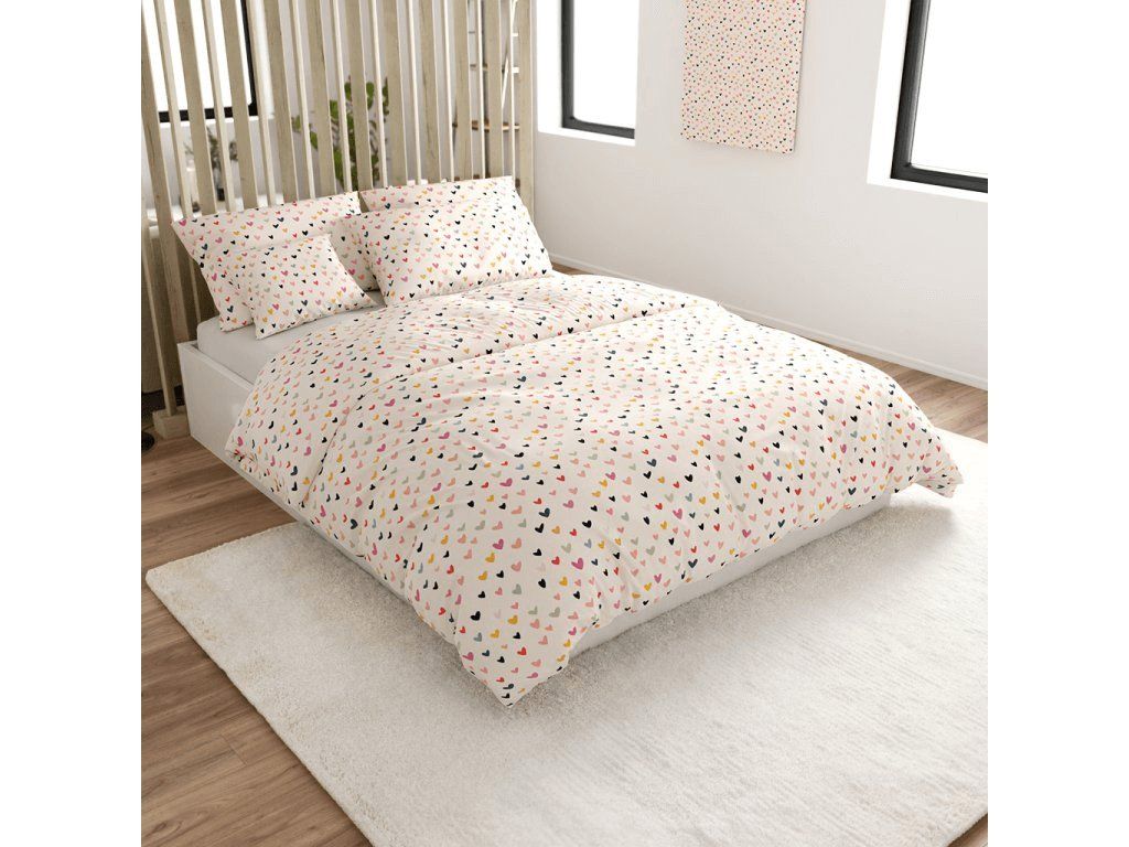 Pamučna posteljina DOTHEARTS POLY krem boje unijet će radost i igru u svaku spavaću sobu svojim veselim dizajnom. Na krem podlozi se nalazi mnoštvo sitnih srdašca u različitim bojama – od ružičaste i narančaste do tirkizne i crne.