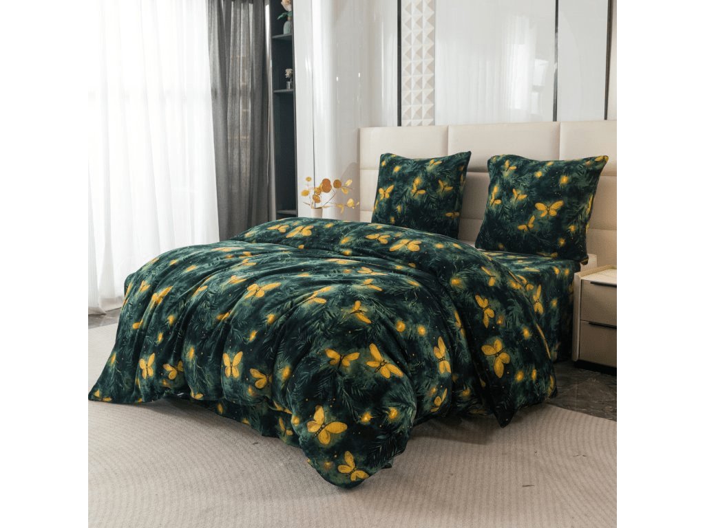 Sada 2ks mikroplyšového povlečení YELLOW BUTTERFLY tmavě zelené + prostěradlo mikroplyš SOFT 180x200 cm bílé, dvoulůžko
