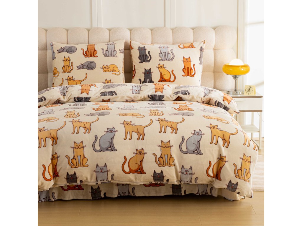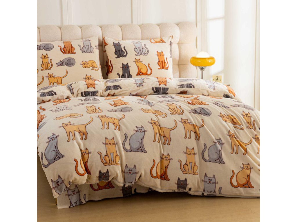 Set posteljine od mikropliša COLORED CATS krem + plahta od mikropliša SOFT 90x200 cm bijela, za jedan krevet