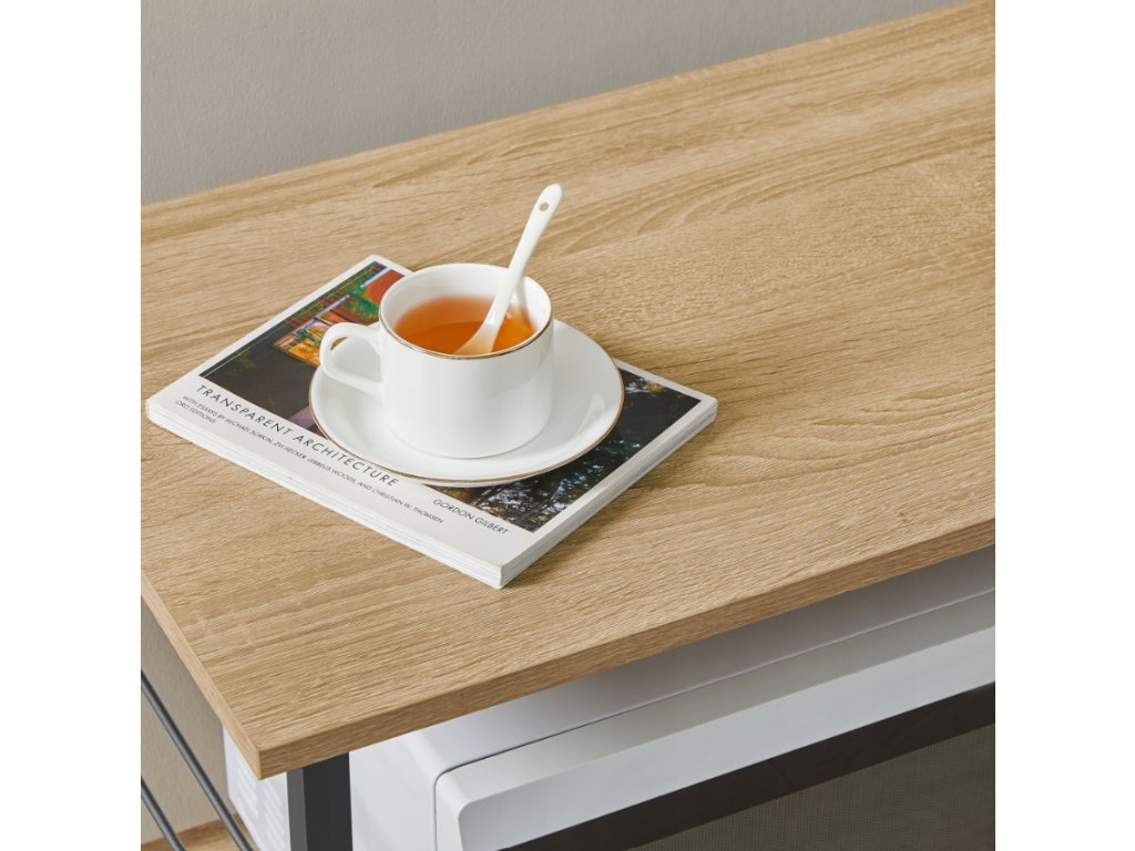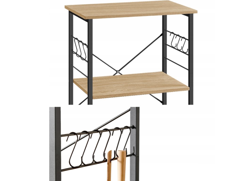 Višenamjenska kuhinjska polica na kotačima TRONUS, crna/somona hrast je idealno rješenje za praktično uređenje vaše kuhinje. Zahvaljujući trima prostranim policama, lako možete pohraniti mikrovalnu pećnicu, aparat za kavu, tanjure i drugu kuhinjsku opremu. Bočne kuke pružaju praktičan prostor za vješanje ručnika, kuhinjskog pribora ili sitnih dodataka.