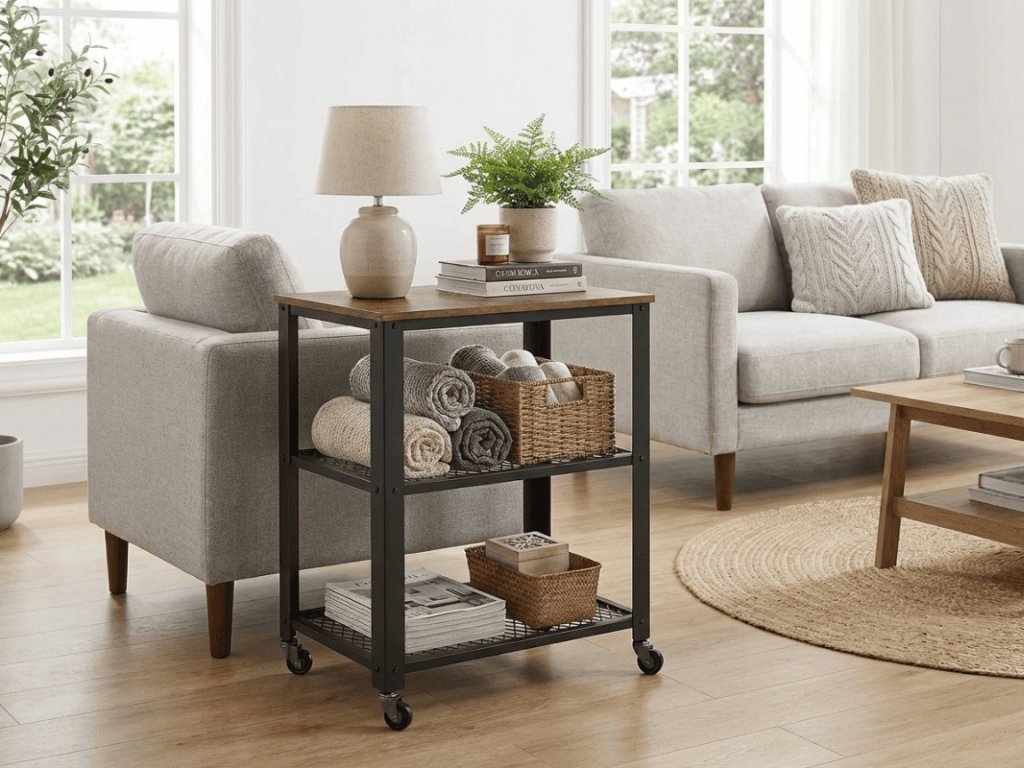 Ovaj praktičan stolić na kotačićima lako se prilagođava vašim svakodnevnim potrebama. Možete ga koristiti kao mobilni servirni stolić za gozbe, pomagač u kućnoj radnoj sobi ili elegantan prostor za odlaganje pored sofe. Njegova kombinacija metalne konstrukcije i rustikalnog dekora daje interijeru osobit šarm. Zahvaljujući kompaktnim dimenzijama, lako ga premjestite tamo gdje ga trenutno trebate – prirodno se uklapa u svaki kut vašeg doma.