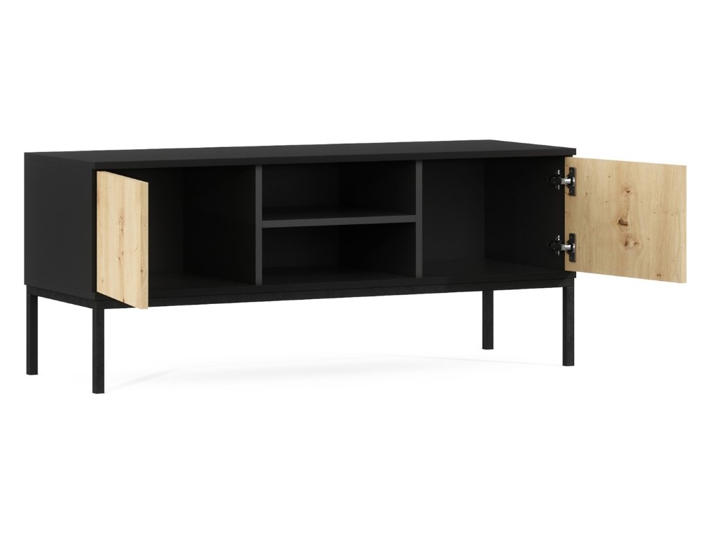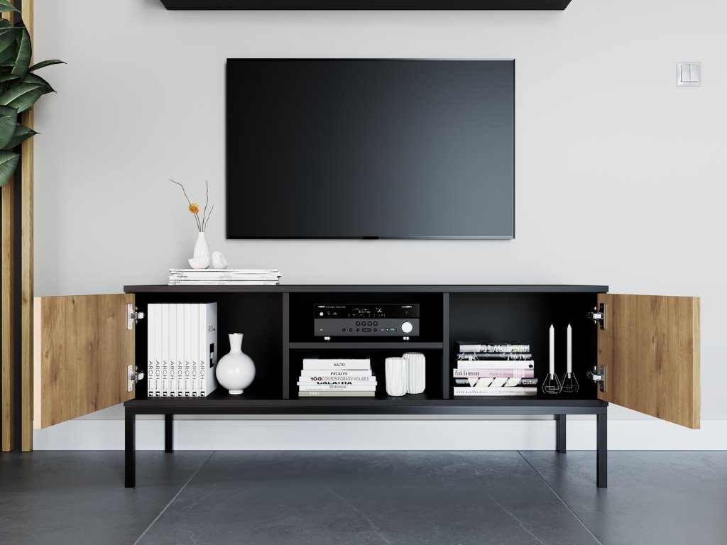 Pretvorite svoju dnevnu sobu u harmonično i stilsko mjesto za odmor. TV stalak u elegantnoj kombinaciji crne boje i dekoru dub artisan donosi moderni izgled s dozom luksuza u prostor. Zahvaljujući praktičnom rasporedu skladišnog prostora, sve potrebno bit će pregledno organizirano – od multimedijskih uređaja do sitnih ukrasa. Stabilna metalna konstrukcija osigurava dug vijek trajanja, dok se minimalistički dizajn uklapa gotovo u svaki interijer. Istaknite jednostavnost koja istovremeno izgleda sofisticirano.