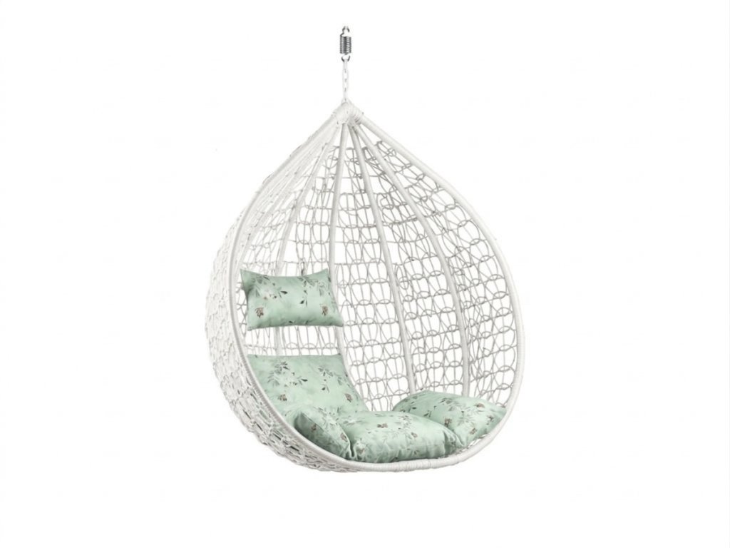 Bijela viseća stolica KOKON bez stalka, svijetlo zeleni jastuk sa uzorkom