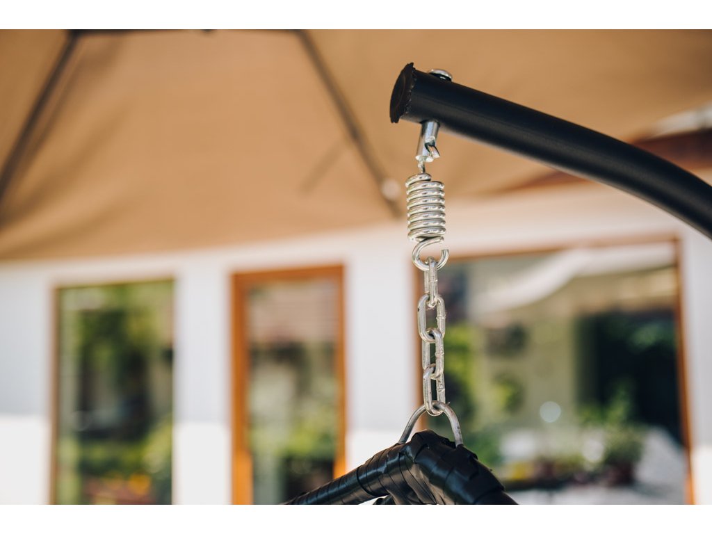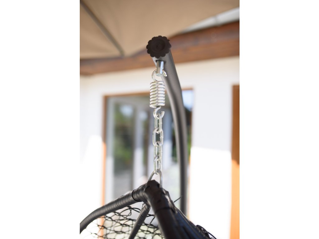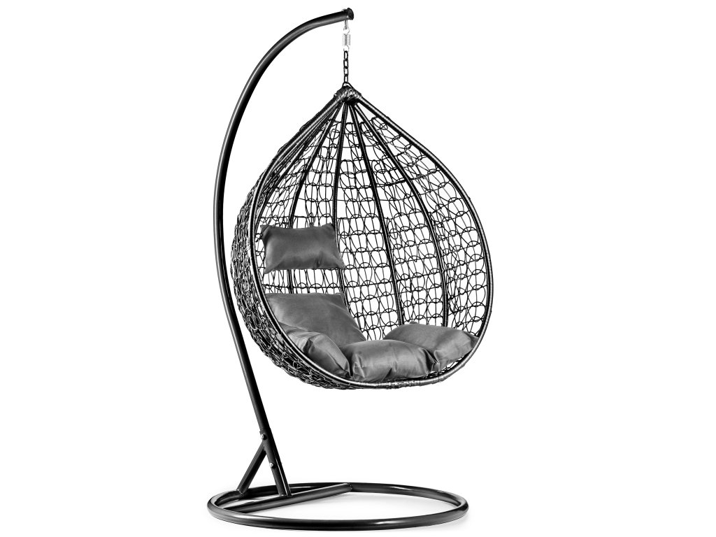 Crna viseća stolica KOKON sa stalkom, sivi jastuk