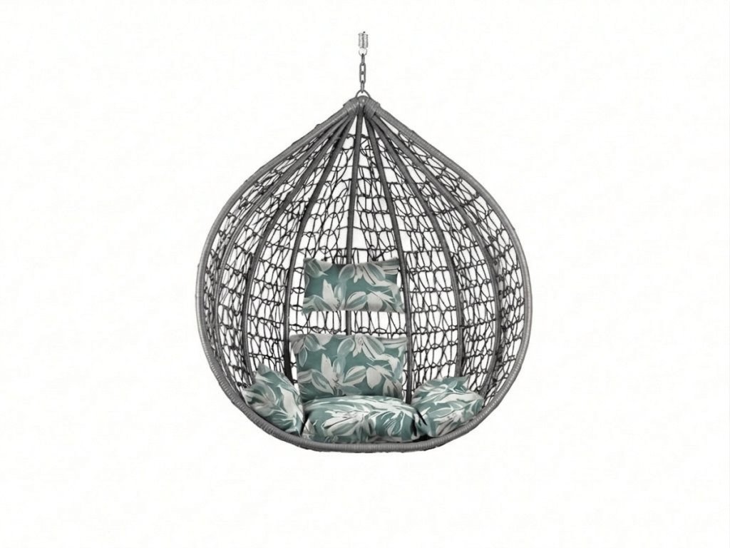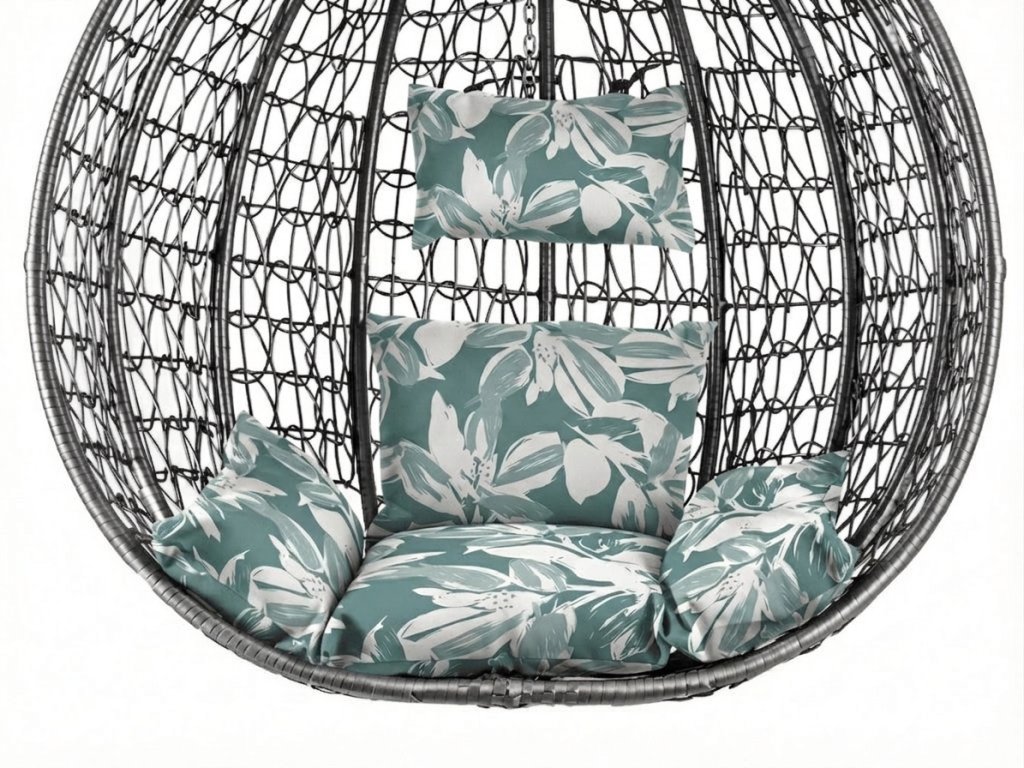 Siva viseća stolica KOKON bez postolja, zeleno-bijeli jastuk