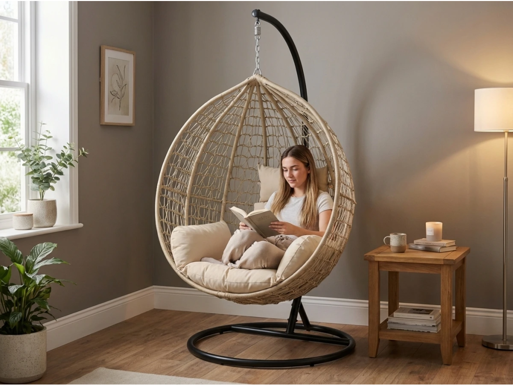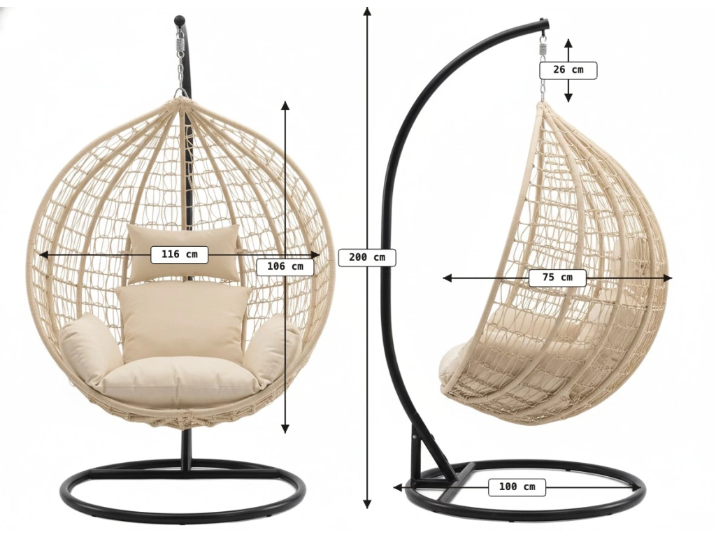 Otkrijte blagotvorne učinke houpanja s našim visećim foteljama, tzv. jajima, koje će maziti i vaše mentalno zdravlje. Houpanje izaziva osjećaj dobrobiti, unutarnjeg mira i učinkovito uklanja psihičku napetost. Kvalitetno izrađene ljuljačke fotelje od umjetnog ratana izrazito su otporne na nepovoljne vremenske uvjete i kućne ljubimce. Umjetni ratan je na prvi pogled gotovo ne razlikljiv od prirodnog. Naše viseće fotelje izvrsno se uklapaju kako u vrt, tako i u interijer. Užijte slobodno vrijeme na ovim foteljama u skandinavskom stilu, koje su među najomiljenijim dijelovima modernog namještaja. Priuštite si luksuznu relaksaciju i unesite u svoj dom i vrt elemente mira i elegancije.